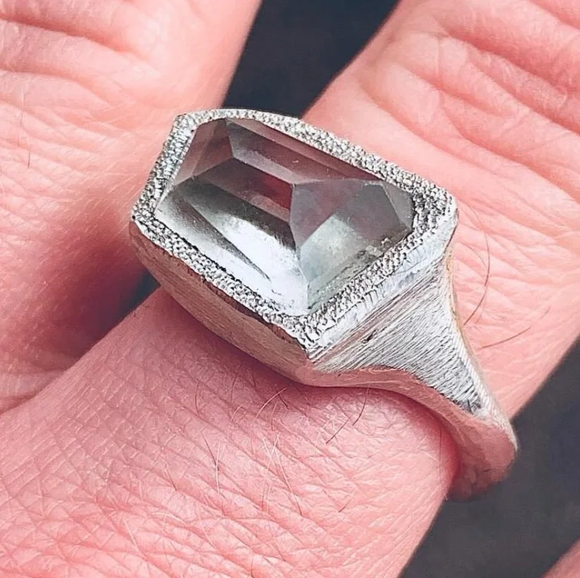 Drawing inspiration from organic shapes and architectural elements, he creates each piece by hand in his studio, combining traditional goldsmithing techniques with a modern sculptural aesthetic that celebrates both the raw beauty of precious metals and the artistry of slow, deliberate craftsmanship.